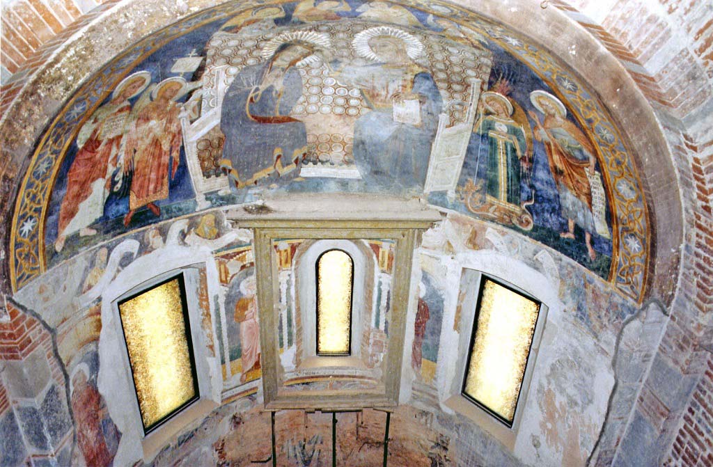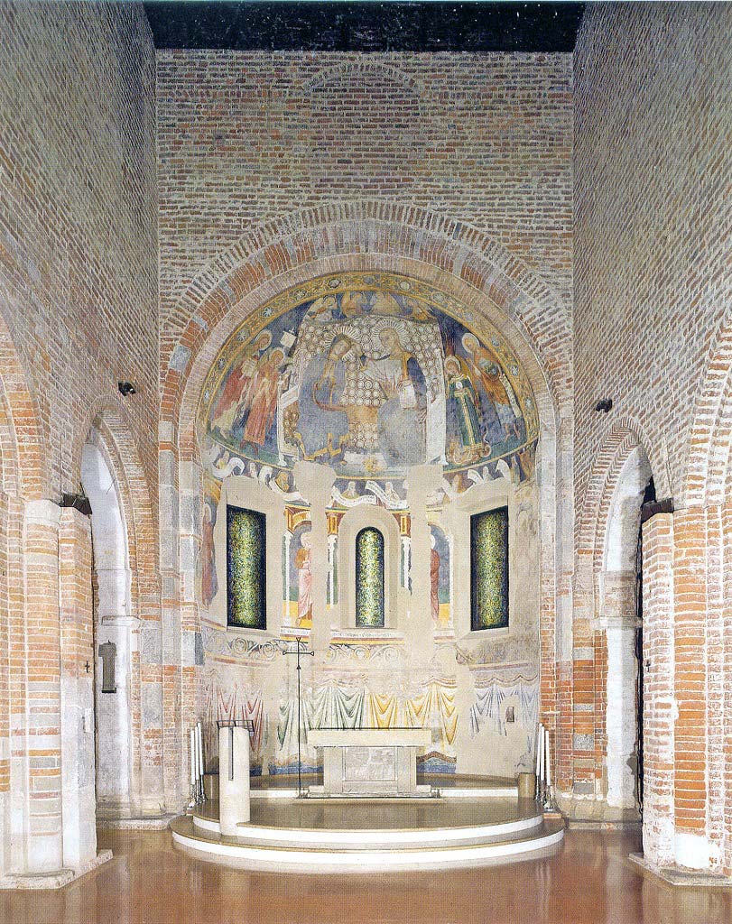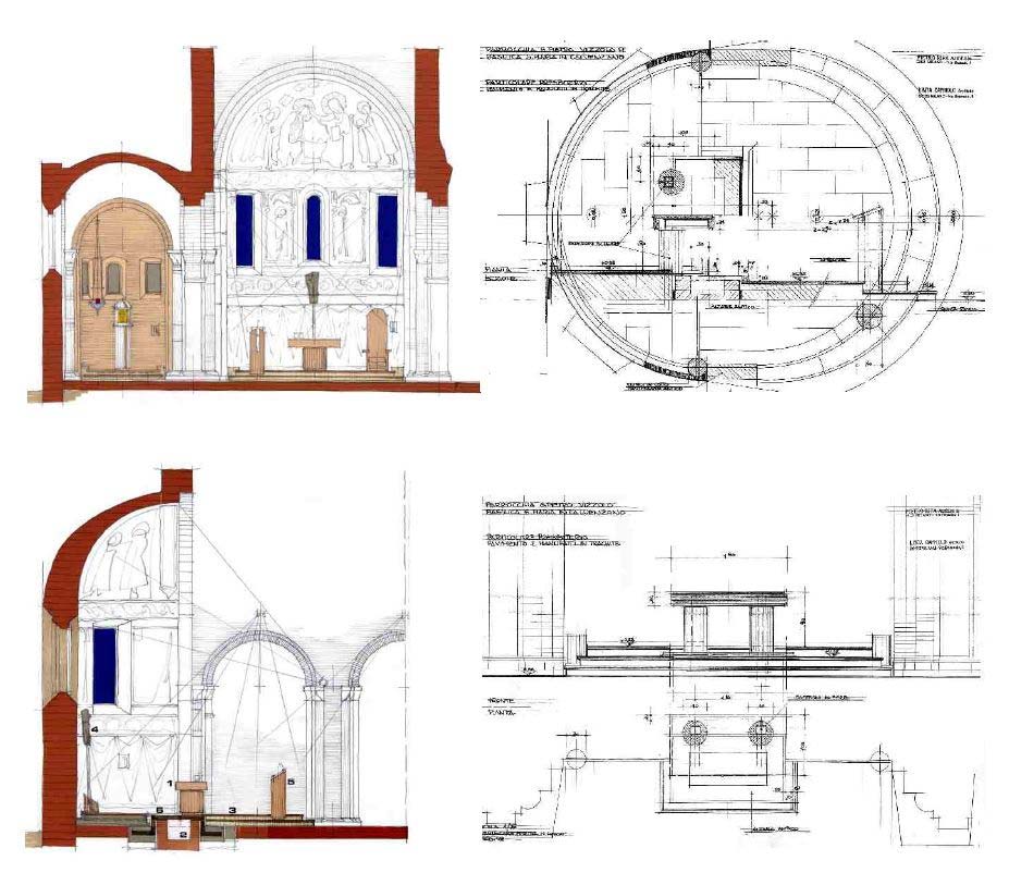 Ricerche storiche, indagini archeologiche, progetto preliminare, definitivo, esecutivo e D.L. (Area Studio S.r.l. Arch.tti Linda Capriolo, Pietro Ripa, Giorgio Ripa), restauro ciclo affreschi Pinin Brambilla Barcillon, vetrate in fusione Maestro Pino Castagna, scavi archeologici Paul Blockey.
